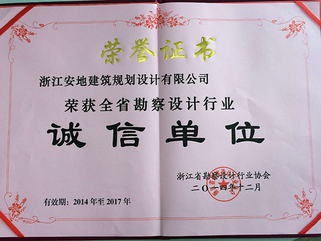 2014年9月我公司向杭州市勘察设计行业协会申报了诚信单位。经杭州市勘察设计行业协会推荐,浙江省勘察设计行业协会领导于11月来我公司进行实地考察与指导。12月,经省协会评定,我公司被评为浙江省勘察设计行业诚信单位。